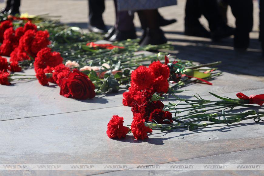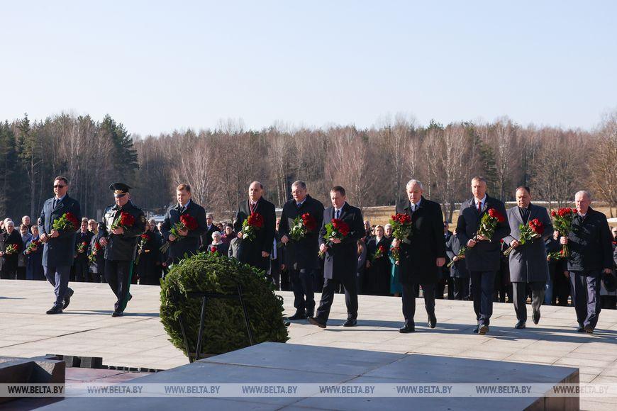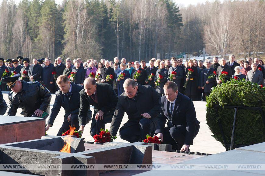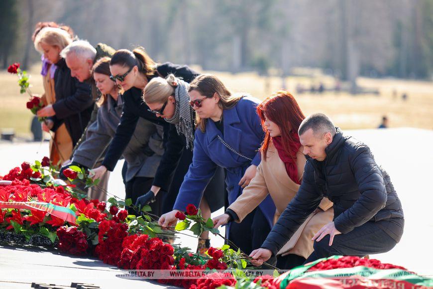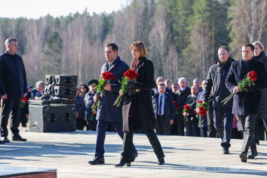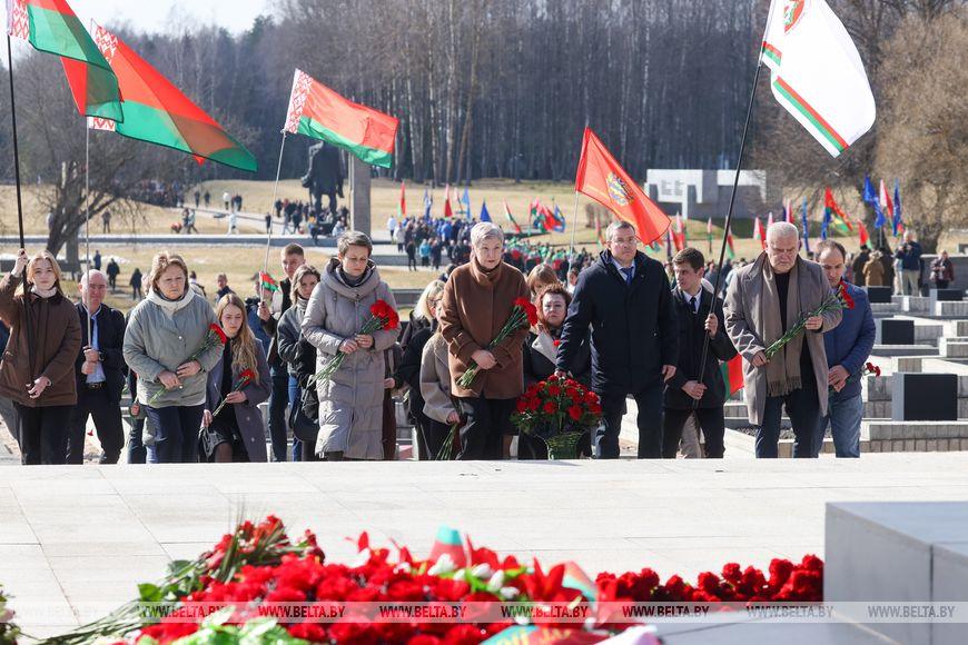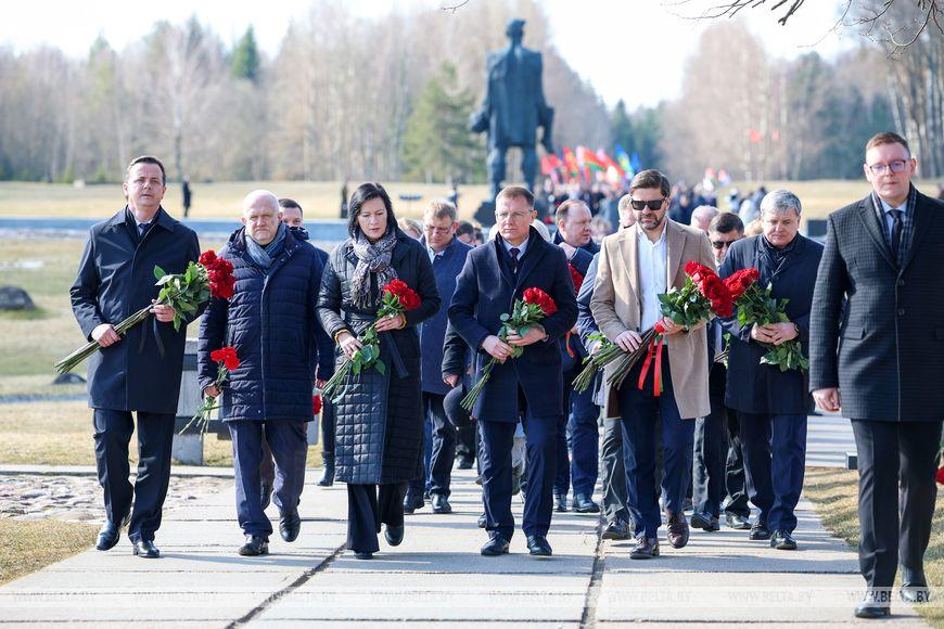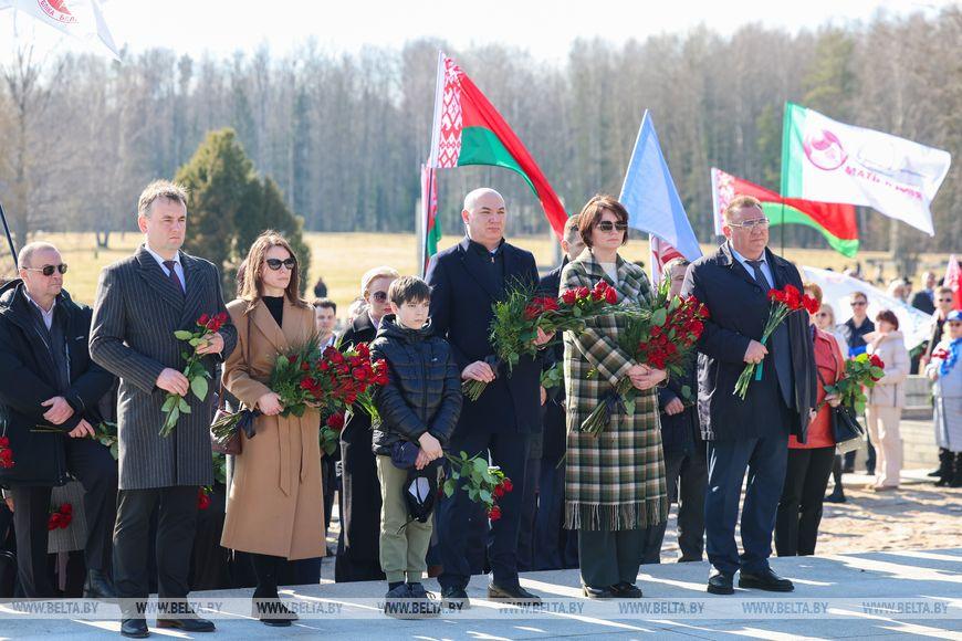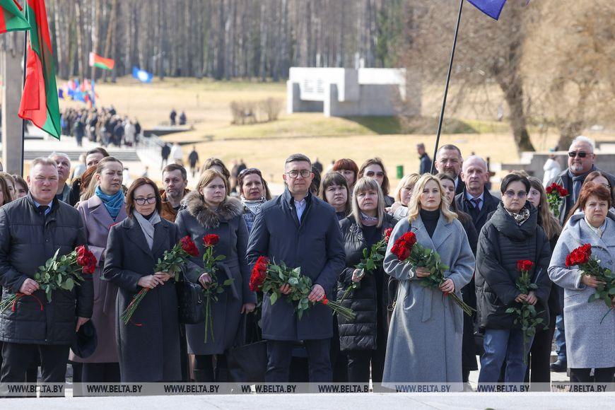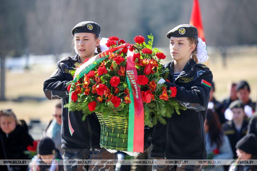 Цветы и цветочные корзины как символ глубокого уважения погибшим хатынцам и всем жертвам войны к фигуре Непокренного человека, братской могиле, в которой упокоен прах сожженных жителей деревни, и к Вечному огню возложили высшие должностные лица, руководители министерств и ведомств, возглавившие свои делегации, представители общественных объединений и организаций, молодежь, школьники, силовики, к которым присоединились воспитанники военно-патриотических клубов.
