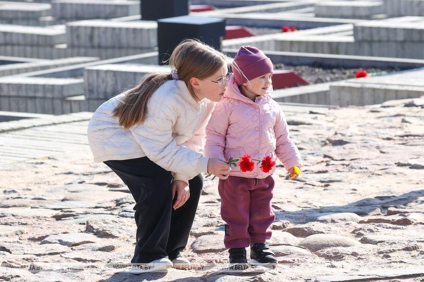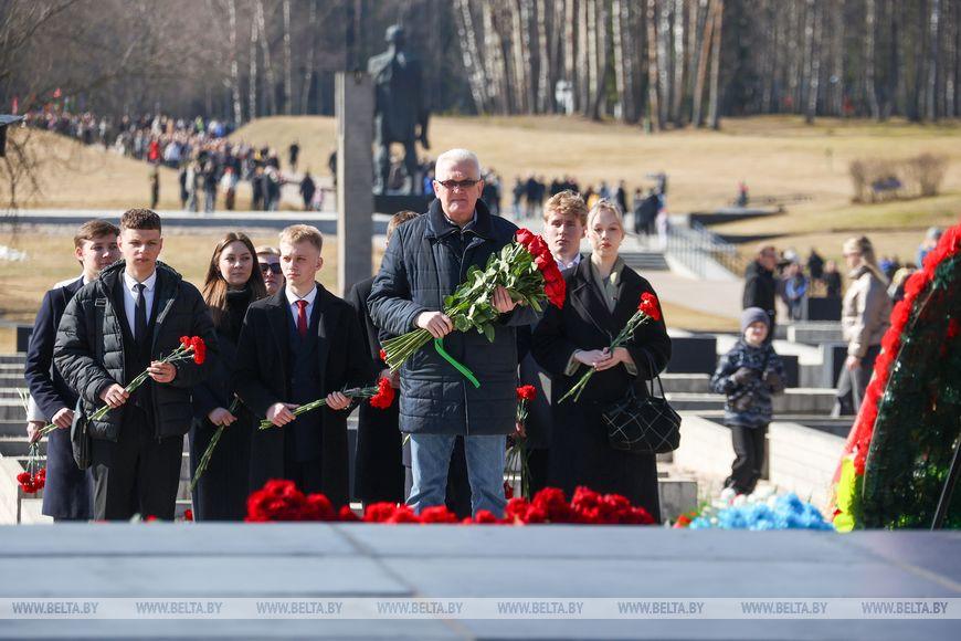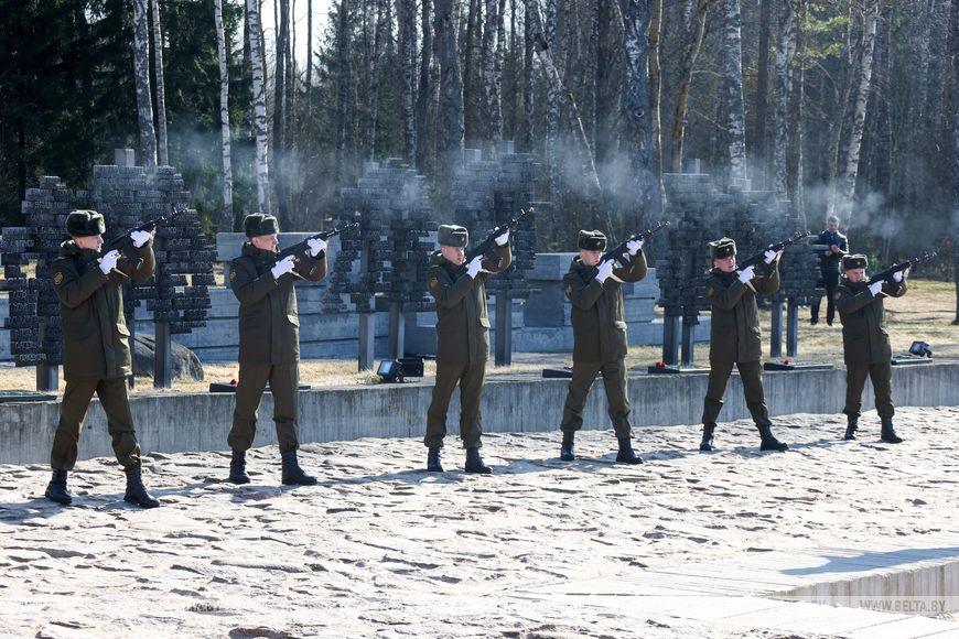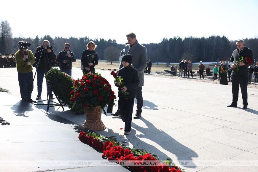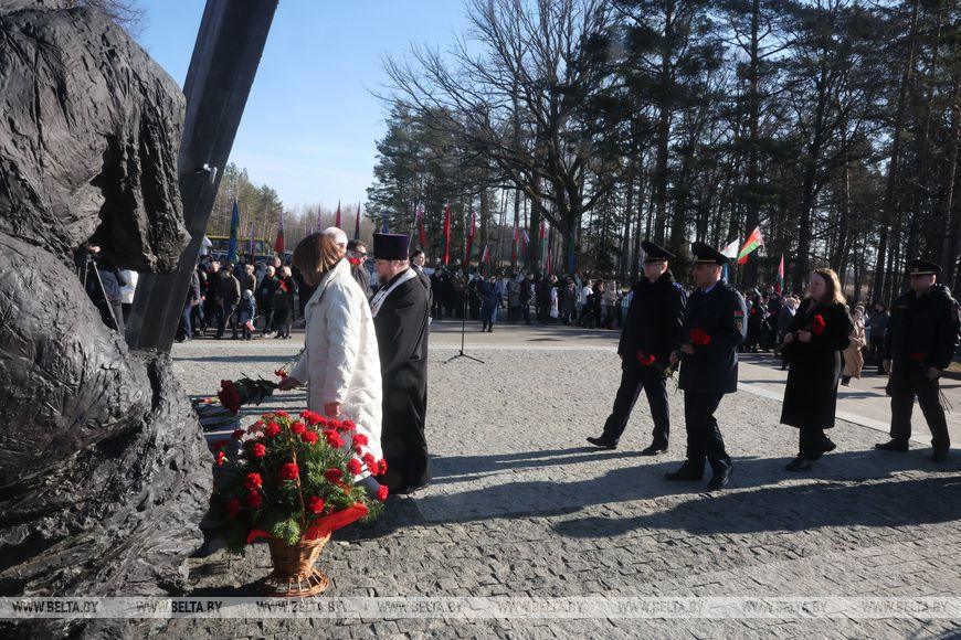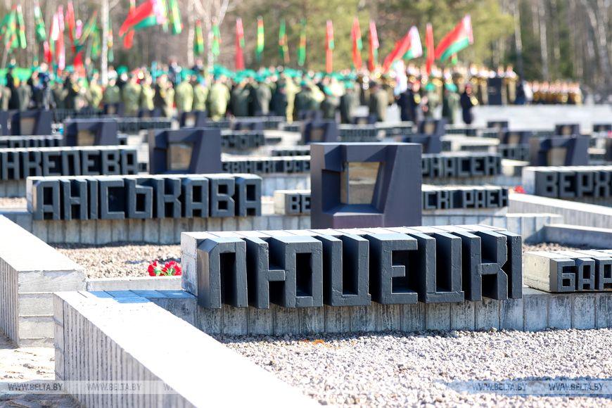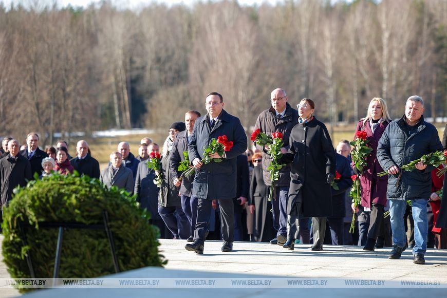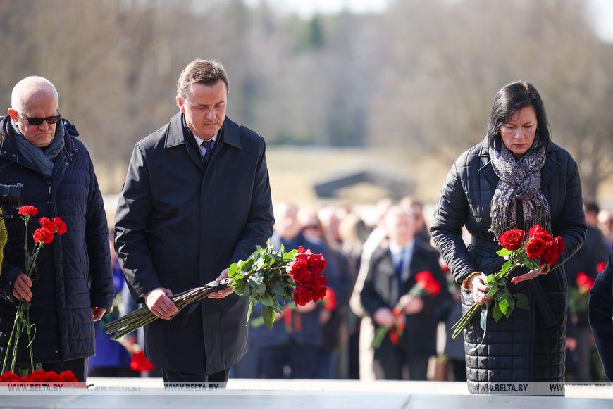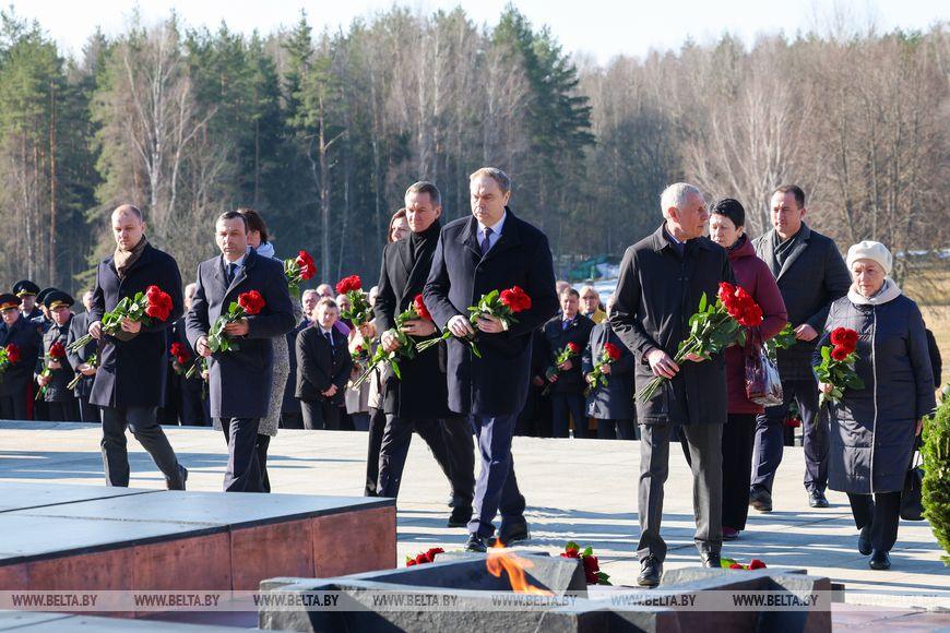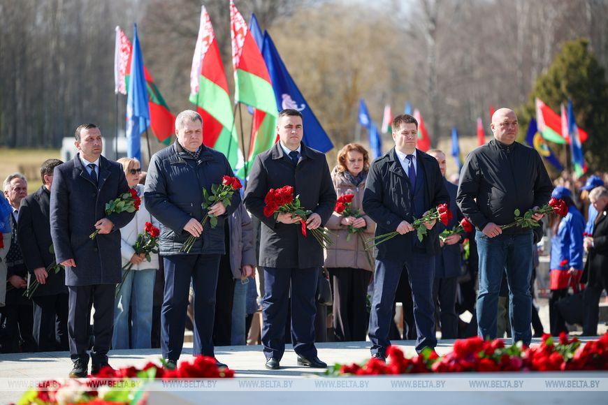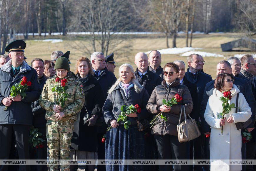 Цветы и цветочные корзины как символ глубокого уважения погибшим хатынцам и всем жертвам войны к фигуре Непокренного человека, братской могиле, в которой упокоен прах сожженных жителей деревни, и к Вечному огню возложили высшие должностные лица, руководители министерств и ведомств, возглавившие свои делегации, представители общественных объединений и организаций, молодежь, школьники, силовики, к которым присоединились воспитанники военно-патриотических клубов.