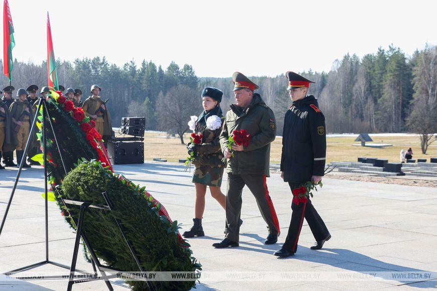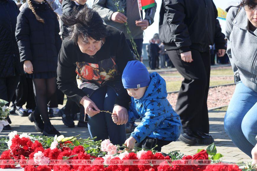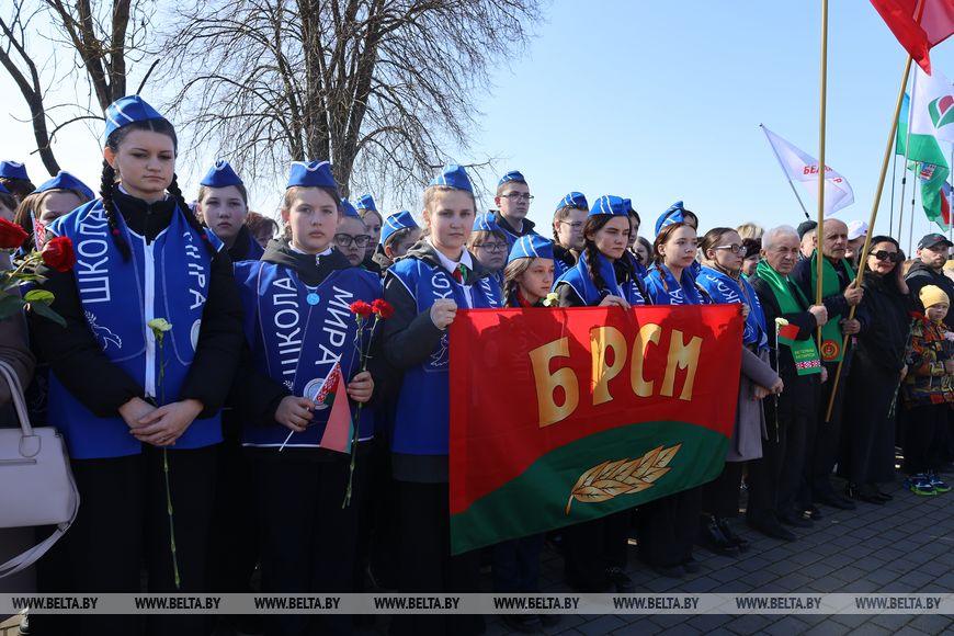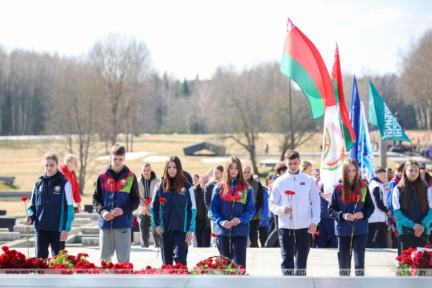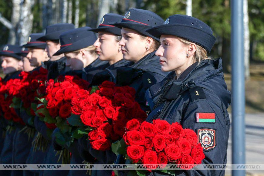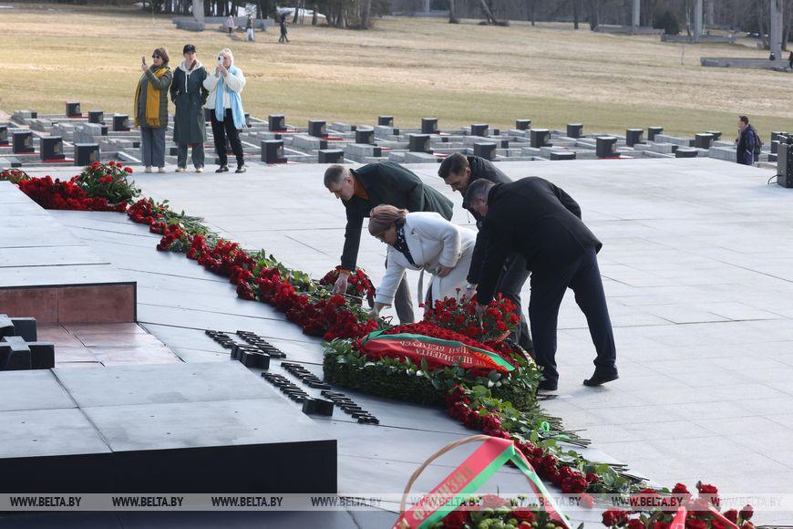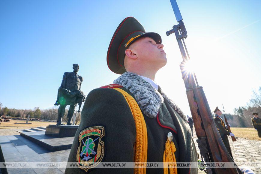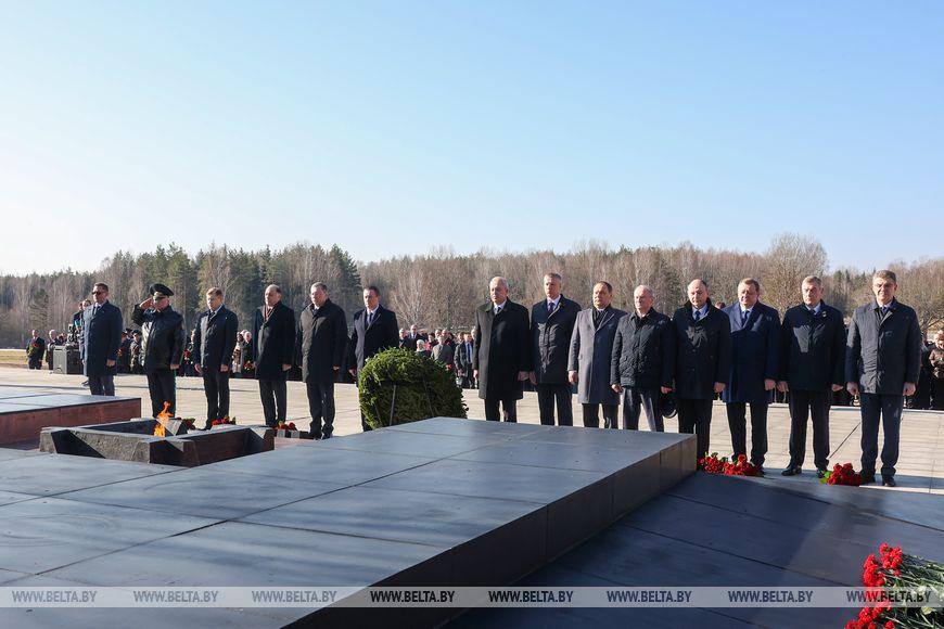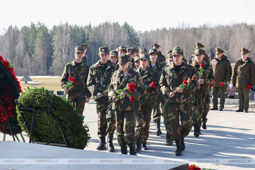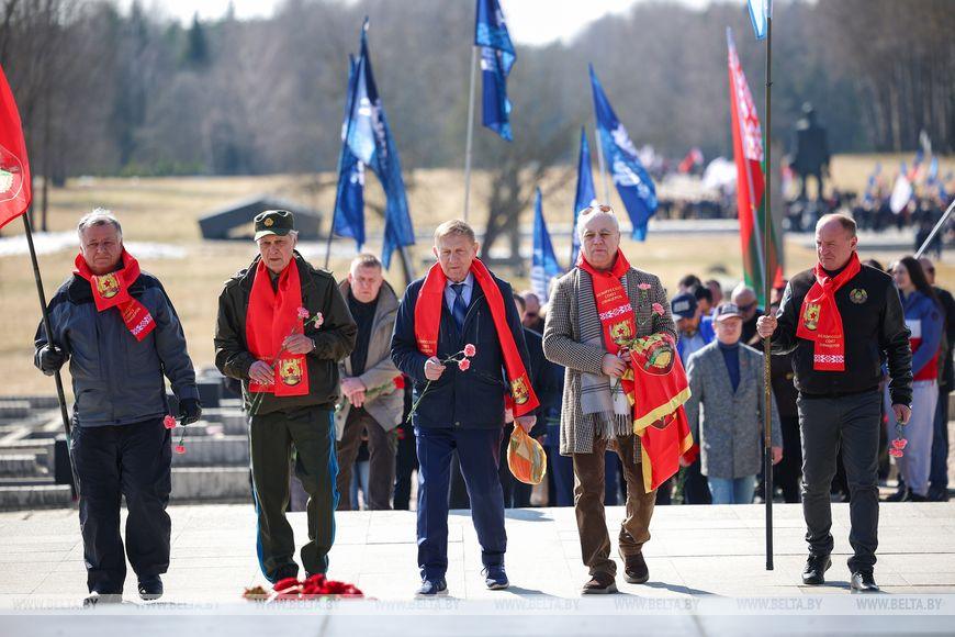 Цветы и цветочные корзины как символ глубокого уважения погибшим хатынцам и всем жертвам войны к фигуре Непокренного человека, братской могиле, в которой упокоен прах сожженных жителей деревни, и к Вечному огню возложили высшие должностные лица, руководители министерств и ведомств, возглавившие свои делегации, представители общественных объединений и организаций, молодежь, школьники, силовики, к которым присоединились воспитанники военно-патриотических клубов.